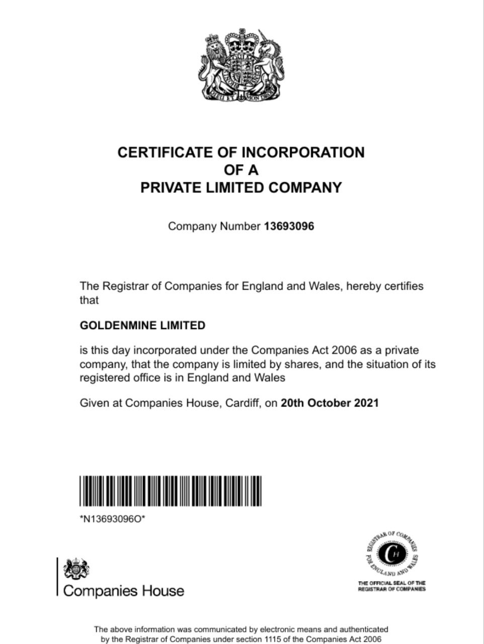 GOLDENMINE LIMITED is a legally registered private limited company in the United Kingdom.